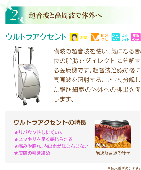 また、ごく稀に皮下出血をおこす場合がありますが、徐々に消えていきます。 - ウルトラアクセントは何回くらい受けると効果的ですか?