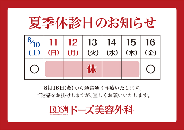 8/11(日)〜15(木)まで休診となります。なお、8/10(土)は通常診療致します。ご迷惑をお掛けしますが、ご理解の程お願い申し上げます。